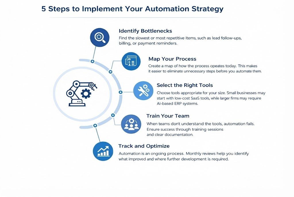- Select the Right Tools: Choose tools appropriate for your size. Small businesses may start with low-cost SaaS tools, while larger firms may require AI-based ERP systems.